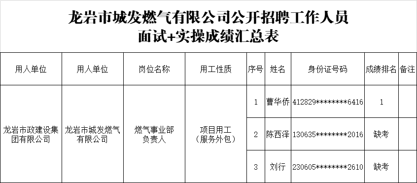 根據(jù)2025年421日發(fā)布的《龍巖市政建設(shè)集團有限公司關(guān)于公開招聘工作人員的公告》有關(guān)要求,現(xiàn)將龍巖市城發(fā)燃氣有限公司燃氣事業(yè)部負責人崗位“面試+實操”成績排名予以公示。